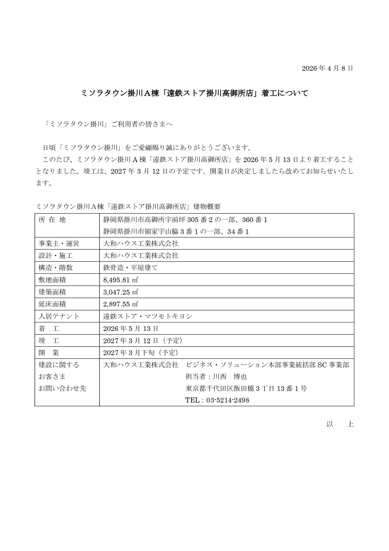 ミソラタウン掛川A棟「遠鉄ストア掛川高御所店」着工について
