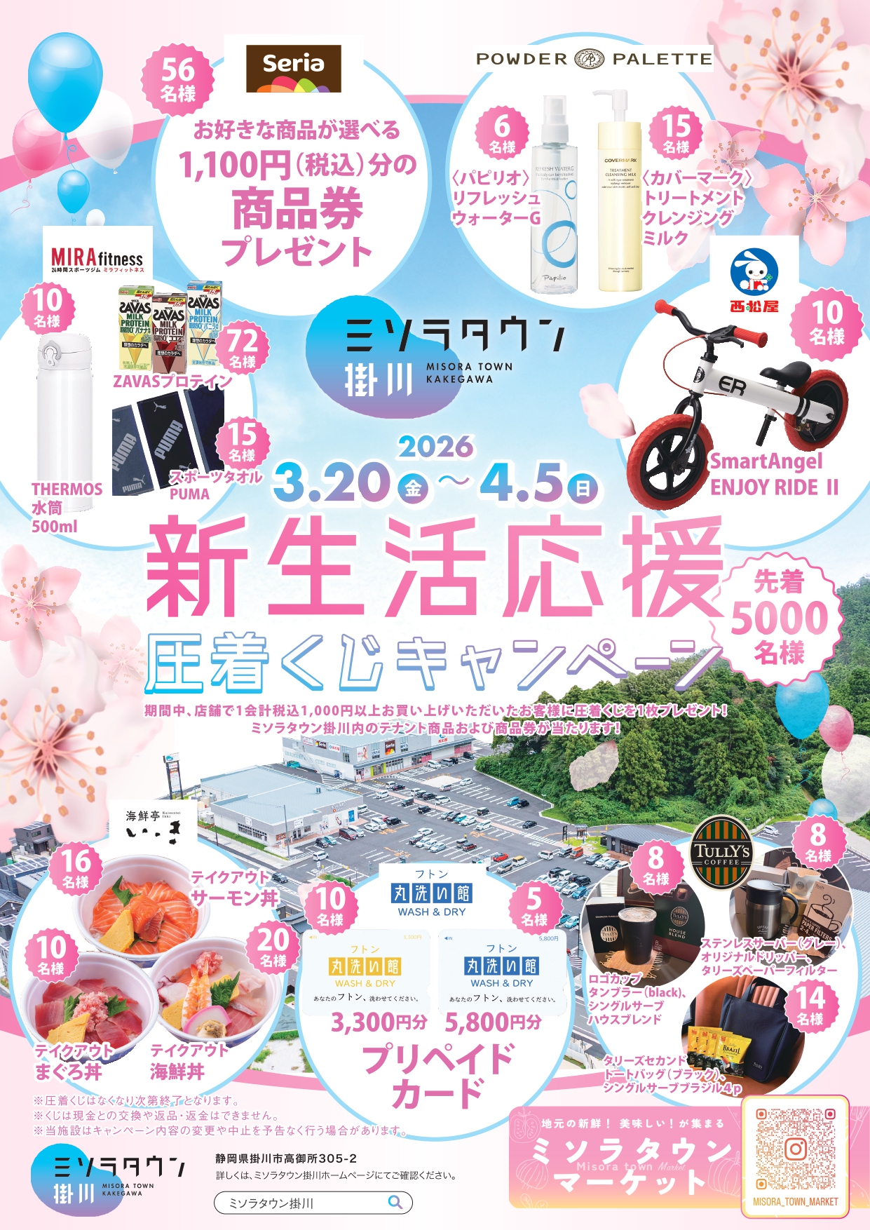 期間中、1回のお会計が1,000円(税込)以上で、 その場で圧着くじを1枚プレゼント 当たりが出たら、ミソラタウン掛川内のテナント商品および商品券をその場でGET!